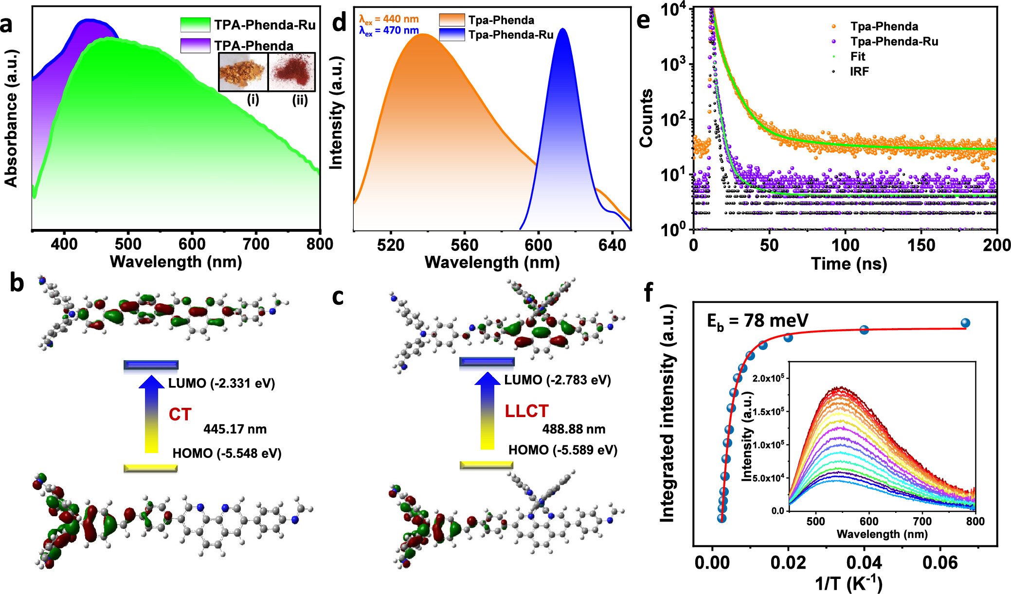 5. 紫外-可见(UV-vis)光谱:Tpa-Phenda和Tpa-Phenda-Ru的吸收带最大值分别位于440 nm和460−480 nm。