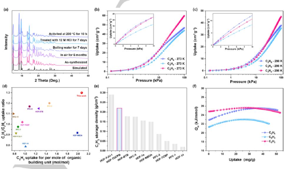 - 在273 K时,HOF-TDCPB对C2H6、C2H4和C2H2的吸附量分别为46.8 cm³/g、43.9 cm³/g和59.7 cm³/g。