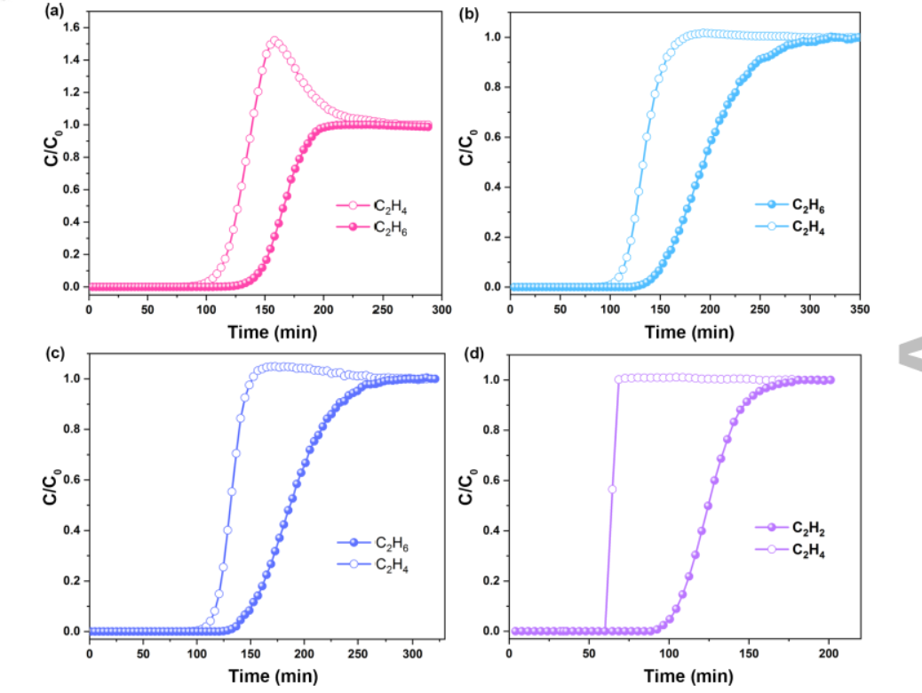 - 首次实现了从C2H6/C2H4/C2H2三元混合物中一步法纯化C2H4,这在HOF材料中是前所未有的。