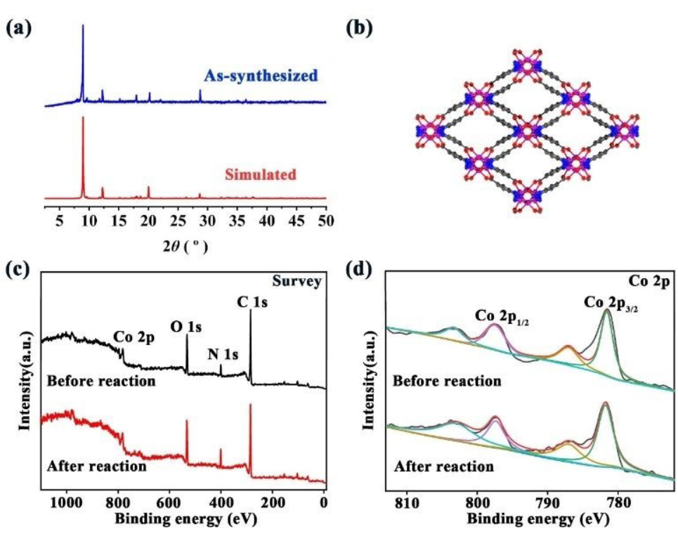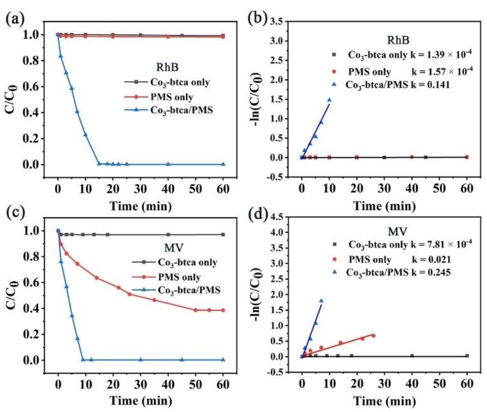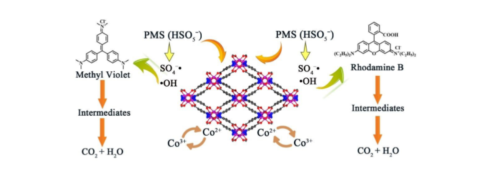 吉林师范大学许彦红&东北师范大学苏忠民老师等报道的本篇文章(New J. Chem., 2024)中开发了一种基于氮富集型Co-MOF(Co3-btca)的异质催化剂,用于通过活化过一硫酸盐(PMS)降解水中的有机染料污染物。实验结果表明,Co3-btca具有微米尺寸和良好的稳定性。在Co3-btca和PMS共存的条件下,甲基紫(MV)的降解率达到99.78%,仅需9分钟,而罗丹明B(RhB)的降解率达到99.58%,仅需15分钟。研究了染料浓度、反应温度、PMS和催化剂用量对降解反应的影响。连续降解实验表明,制备的Co3-btca催化剂具有良好的稳定性和易于回收性,可用于废水中有机污染物的去除。自由基捕获测量证实SO4−•和•OH自由基是去除有机染料的主要活性物种。此外,提出了有机染料的可能降解机制。这些特性使Co3-btca成为稳定异质催化剂,用于有效活化PMS进行环境修复。