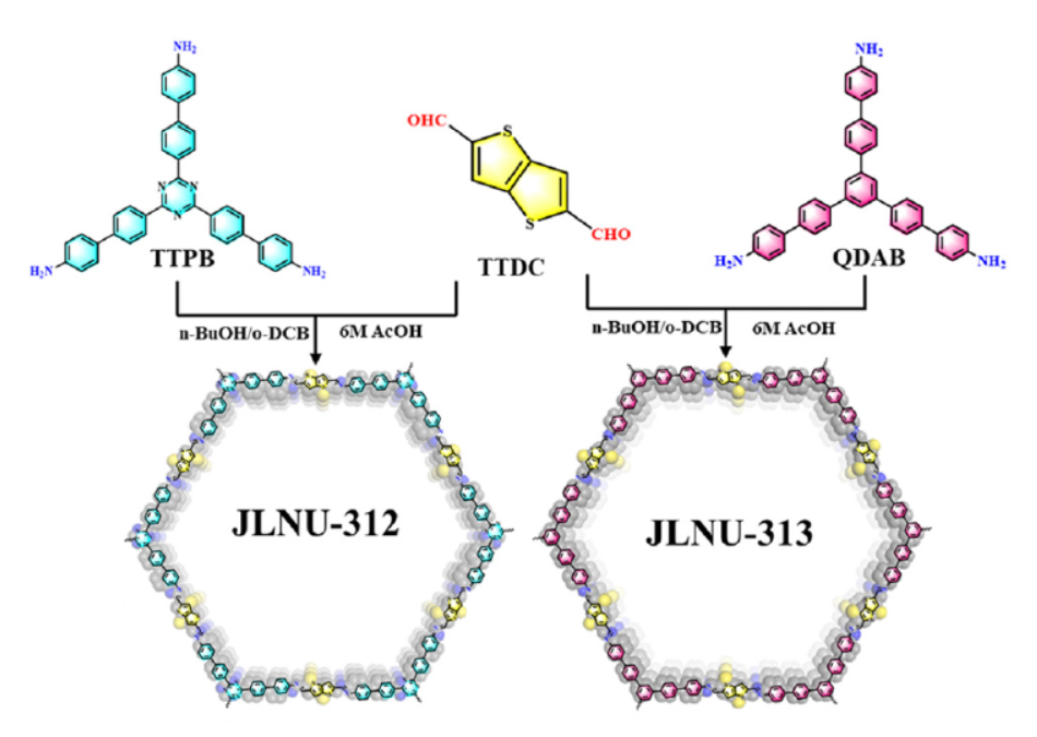 - 将4,400 0,400 0 00-(1,3,5-triazinocyclo-2,4,6triyl)tris(([1,1-biphenyl]-4-amine)) (TTPB, 23.3 mg, 0.04 mmol), 和thieno[3,2-B]thiophene-2,5-dicarboxaldehyde (TTDC, 11.8 mg, 0.06 mmol)溶解在n-butanol/o-dichlorobenzene (1 mL, 3/1 in vol)中。
