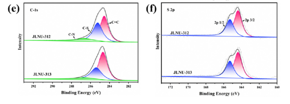 - JLNU-312和JLNU-313的XPS分析显示了C 1s, N 1s, S 2s和S 2p的峰,确认了材料中含有噻吩结构和席夫碱结构。