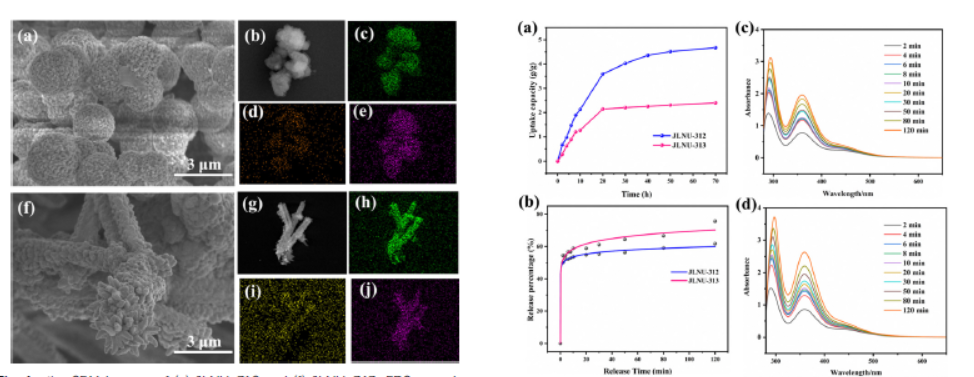 - SEM图像显示JLNU-312为小颗粒聚集成的规则球状结构,JLNU-313为楔形结构堆叠成棒状结构。