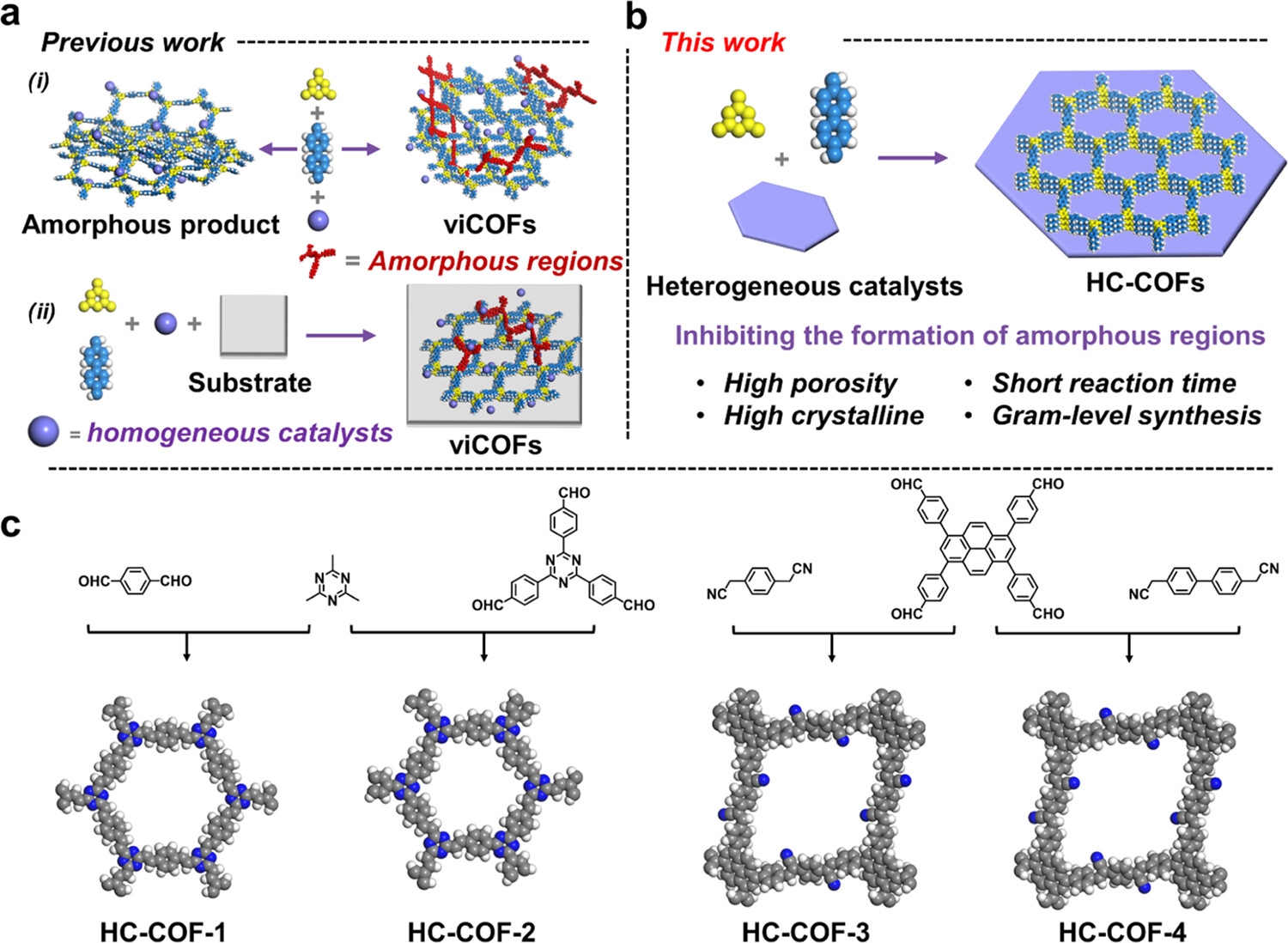 1. viCOFs的合成通常在均相催化剂如KOH或三氟乙酸的存在下进行,但高度有序的viCOFs并不总是能够获得,因为在均相体系中viCOF层的无约束生长容易产生错误链接。