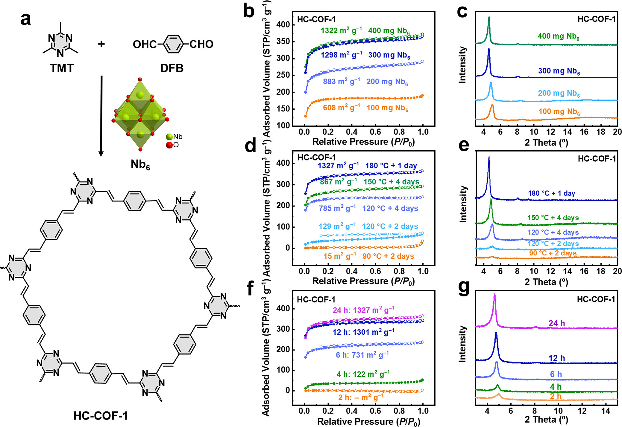 - 在放大的反应体系中使用Nb6催化剂,通过相同的合成步骤制备出0.98克HC-COF-1。