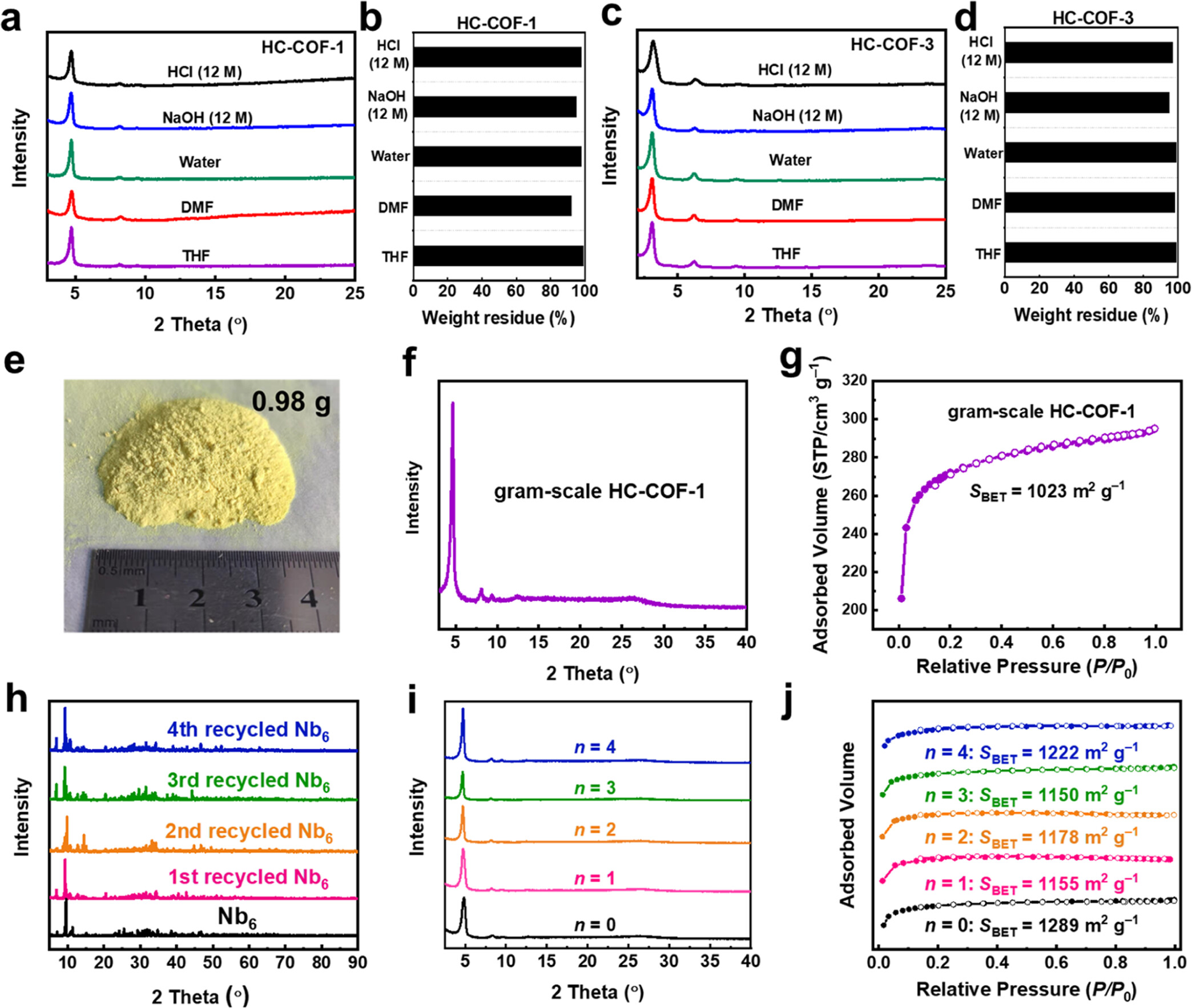 - 将HC-COF-1和HC-COF-3分别在12M HCl溶液、12M NaOH溶液、水中、DMF和THF中浸泡3天,测试其化学稳定性。