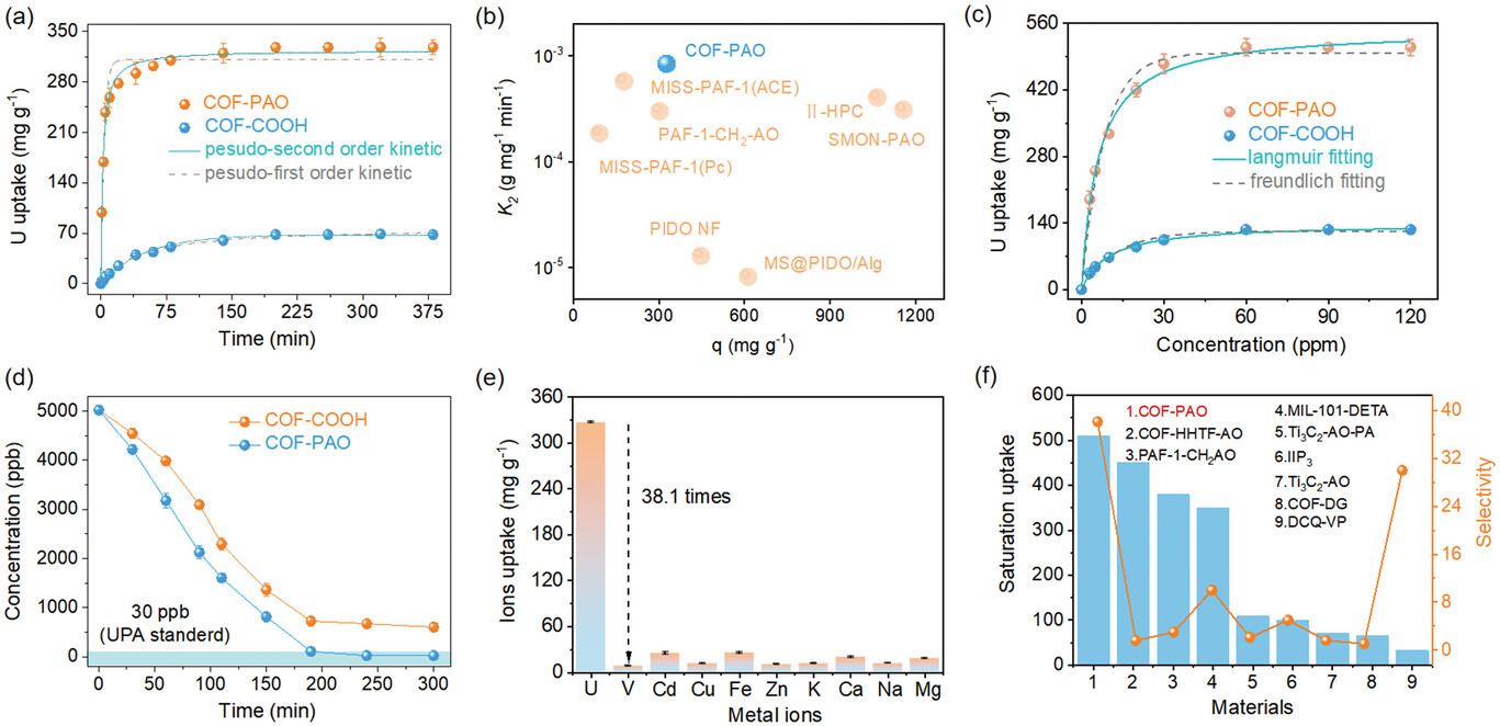 - COF-PAO在6小时接触后的最大铀容量为328.0 mg g−1,远高于COF-COOH。