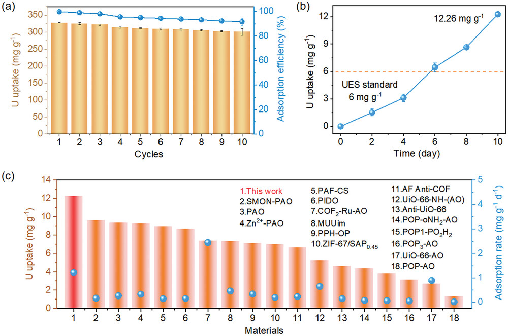 - COF-PAO在自然海水中经过10天接触后,实现了约12.26 mg-U/g的铀提取容量。