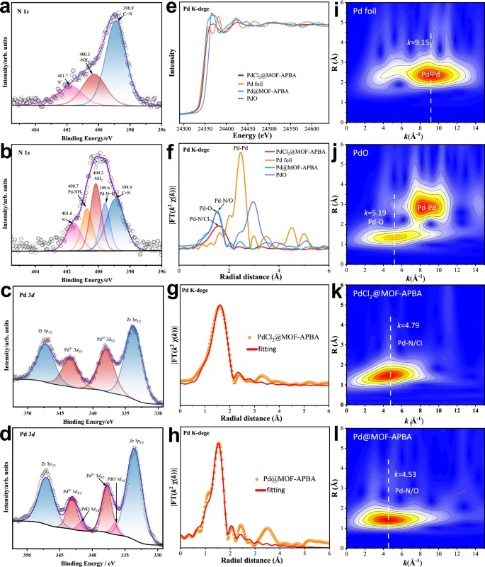 - Pd@MOF-APBA的N 1s XPS谱图显示了与Pd配位的新峰,表明APBA与Pd的成功配位。