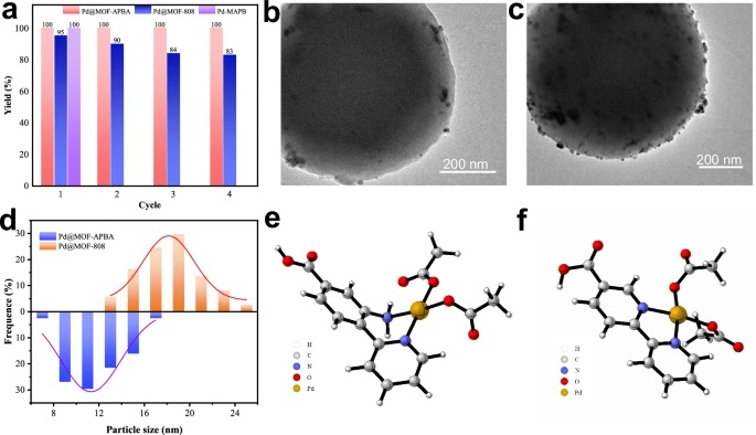 3. 本研究设计并合成了多功能配体APBA,通过后合成修饰策略将其引入MOF-808中,成功制备了单一位点催化剂Pd@MOF-APBA。该催化剂通过N,N'-双齿配体APBA与钯离子的配位,有效避免了金属的浸出和聚集,提高了催化剂的稳定性和可回收性。