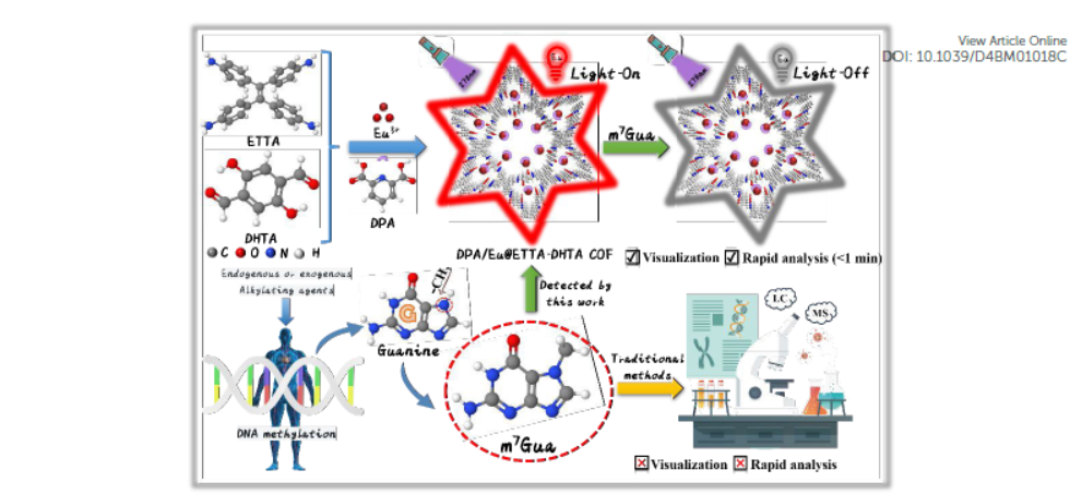 华东理工大学郝继娜、李永生老师等报道的本篇文章(Biomater. Sci., 2024)中报道了一种新型的稀土掺杂共价有机框架(Ln-COF)荧光探针,DPA/Eu@ETTA-DHTA,用于快速、特异性地检测7-甲基鸟嘌呤(m7Gua),这是反映DNA甲基化程度的一个生物标志物,对癌症早期筛查和诊断具有重要意义。该探针通过将吡啶-2,6-二羧酸(DPA)作为能量供体和识别位点,以及Eu^3+离子作为信号报告者,整合到具有高孔隙度和可用结合位点的稳定COF基质中。显著的是,Eu^3+离子的特有发光可以通过接枝的DPA在COF探针中被激发,并可通过m7Gua的加入通过竞争性吸收过程有效猝灭,从而实现对m7Gua的检测。该Ln-COF基础的荧光平台对m7Gua表现出高选择性和快速响应(<1分钟),即使在尿液中主要共存物种存在的情况下,也能以低检测限(μM级)进行检测,使其能够作为实际探针用于临床监测人类尿液样本中m7Gua的水平。本研究提供了一种方便、节省时间和经济的方法,用于直观检测m7Gua,并为设计用于诊断中DNA甲基化评估的发光COF基础探针开辟了新视角。