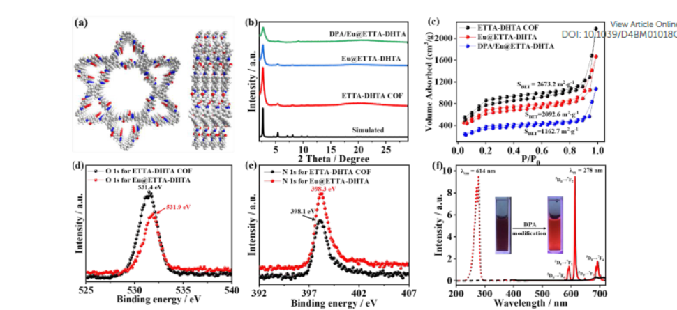- 测试结果:BET比表面积从ETTA-DHTA COF的2673.2 m^2·g^-1降低至DPA/Eu@ETTA-DHTA的1162 m^2·g^-1。