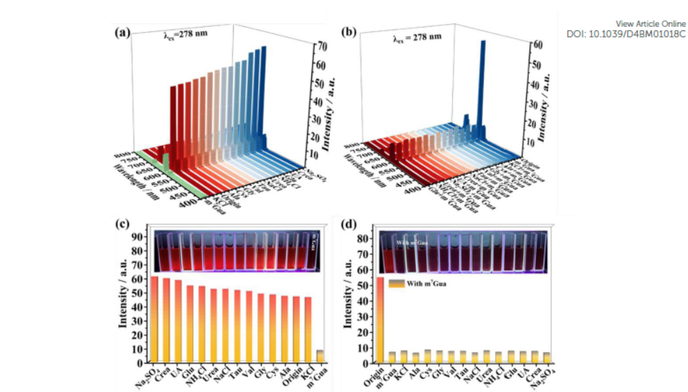 - 测试结果:DPA/Eu@ETTA-DHTA COF对m7Gua的选择性高于其他尿中常见物种,发光强度变化(ΔI)远小于仅含m7Gua的悬浮液。
