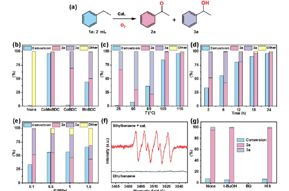 3)作者开发了一种钴-锰双金属有机框架材料CoMnBDC,通过调整金属中心的氧化还原特性,实现了对乙苯的高效催化氧化。这种材料不仅在结构上具有创新,而且在催化性能上也超越了现有的单金属有机框架材料。