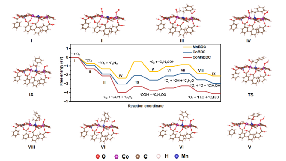 - 通过DFT计算,研究了CoMnBDC催化氧化乙苯的反应机理,包括过渡态的能量障碍和中间体的稳定性。