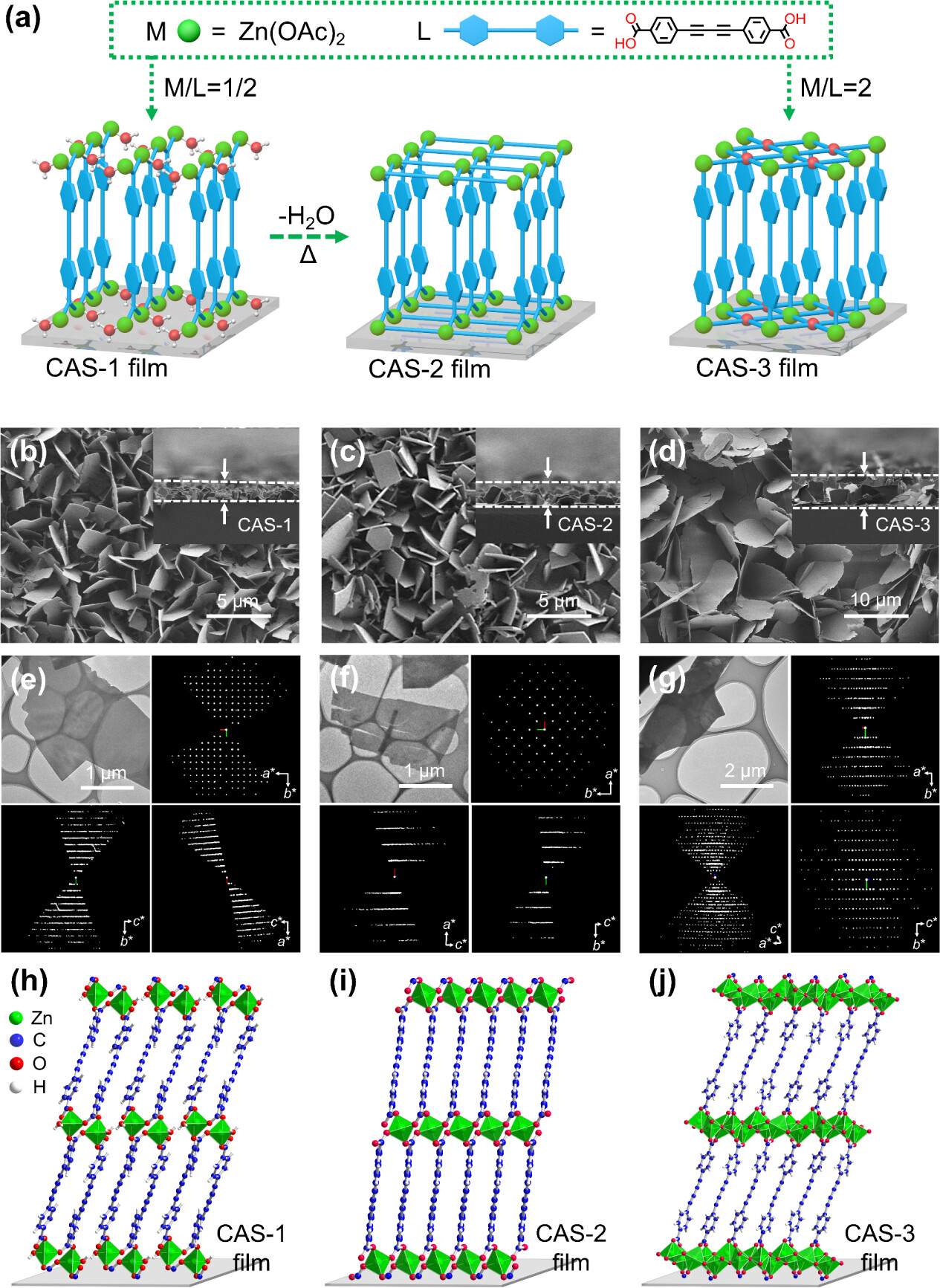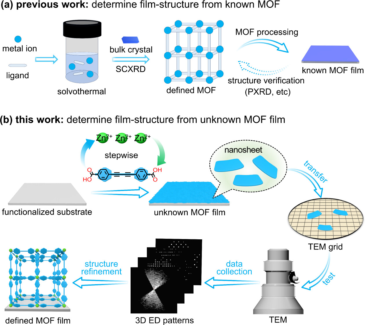 1) 使用透射电子显微镜(TEM)对薄膜中的纳米晶体进行三维电子衍射(3D ED)分析,确定MOF结构。