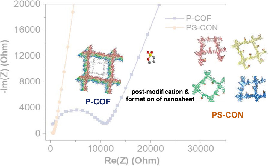 Pohang University of Science and Technology 的Sarah S. Park、Eunsung Lee等报道的本篇文章(ACS Appl. Mater. Interfaces 2024)中提出了一种新颖的方法,通过后修饰技术在合成过程中诱导共价有机框架(COFs)的自剥离,从而得到具有吡啶硫酸贝特因基团的共价有机纳米片,称为PS-CON。这种材料由于吡啶阳离子和硫酸贝特因阴离子的战略性排列,显著增强了锂离子的解离。PS-CON展示了卓越的离子导电性,室温下为2.19 × 10^−4 S cm^−1,并且具有较低的活化能(0.26 eV)和宽广的电化学稳定窗口(4.05 V)。此外,对称电池(Li|Li@PS-CON|Li)展示了超过1200小时的稳定锂镀层/剥离性能,突显了基于吡啶硫酸贝特因的两性离子纳米片作为高性能有机电解质的巨大潜力。