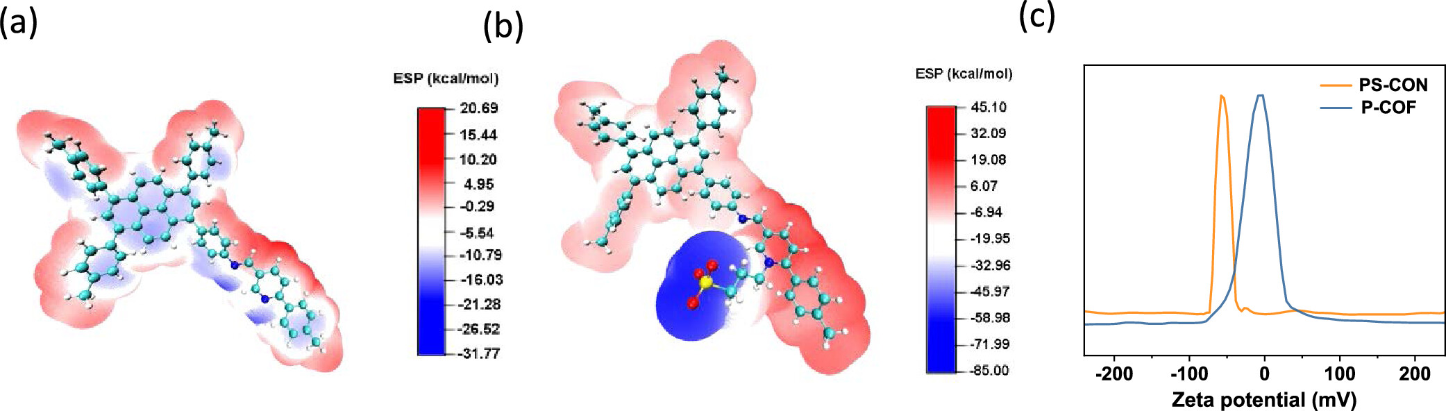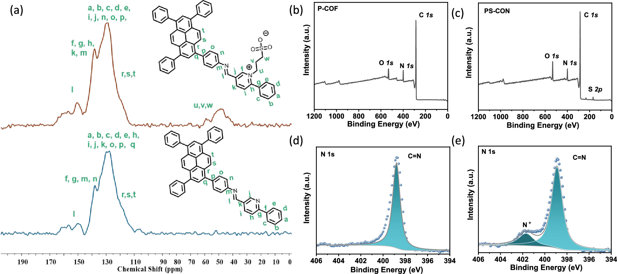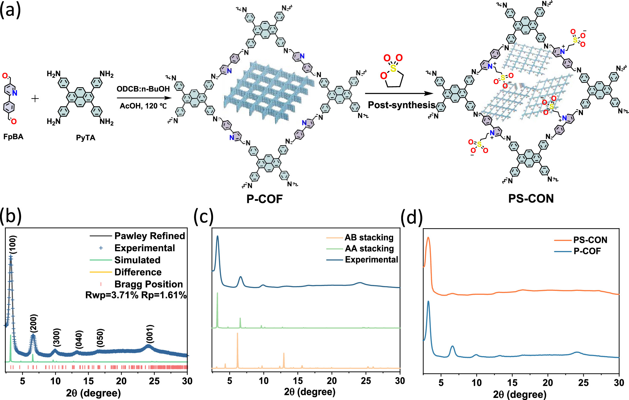 1) P-COF和PS-CON的PXRD图谱显示了材料的高结晶性,P-COF的衍射峰位于3.2°、6.5°、9.6°、13.2°、16.5°和24.1°。