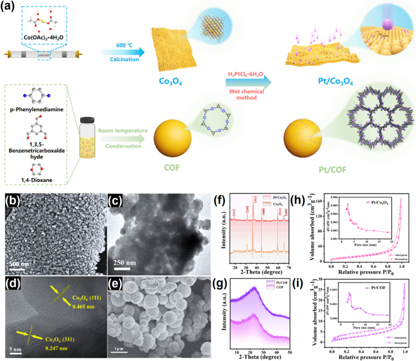 1) 将Co3O4和COF基底通过低温固液反应进行铂化处理,形成Pt/Co3O4和Pt/COF。