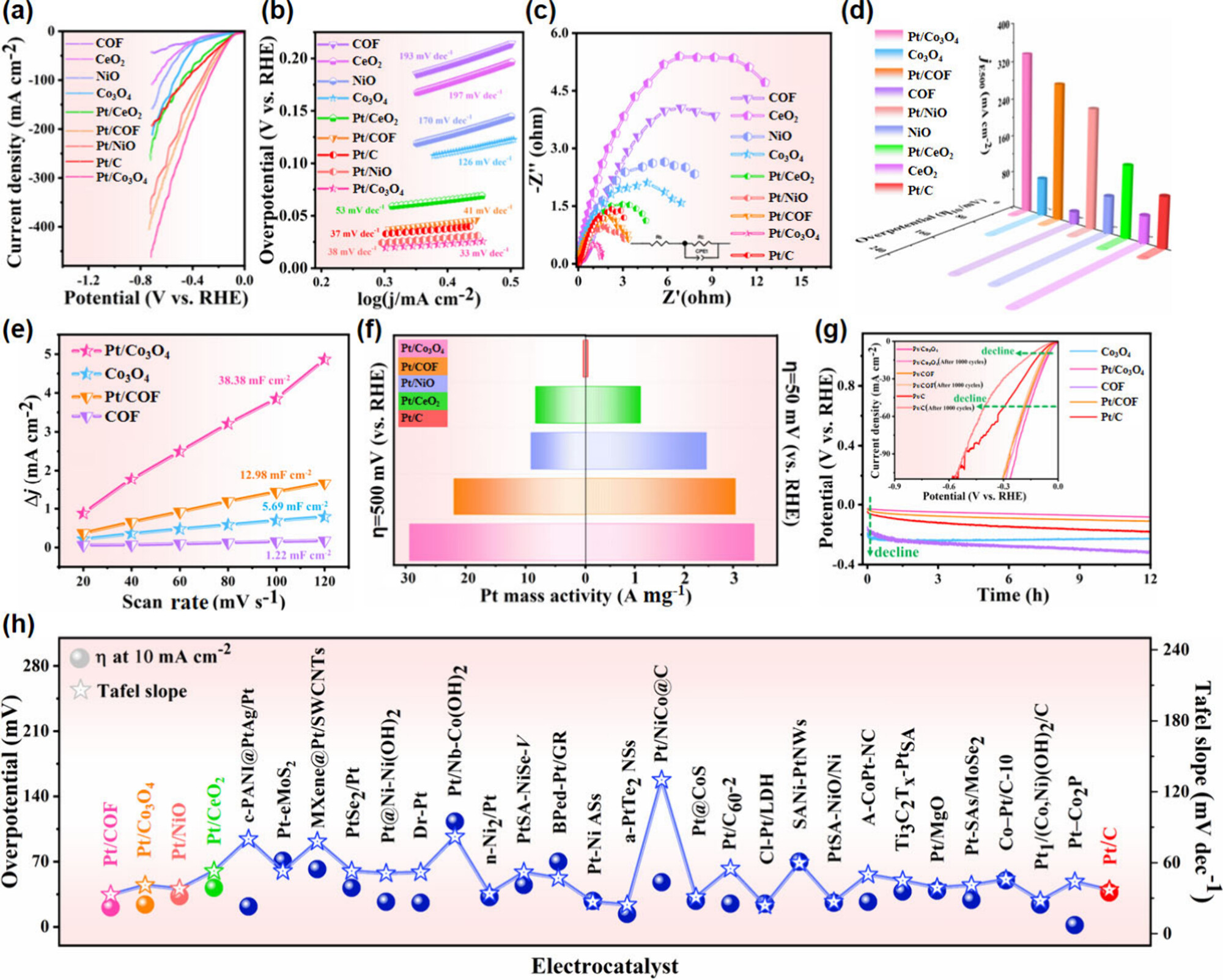 - Pt/Co3O4和Pt/COF在10 mA cm^−2时的过电位分别为21 mV和23 mV,远低于商业Pt/C的37 mV。