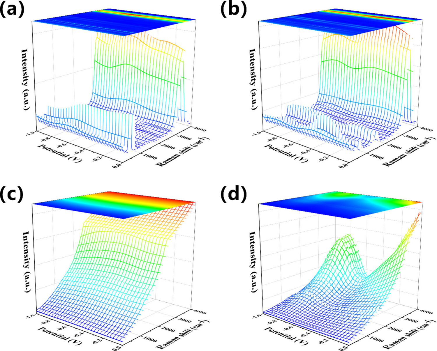 1) 在不同电位下对Pt/Co3O4和Pt/COF进行原位拉曼光谱测试,以研究催化剂表面物种和化学键合的变化。