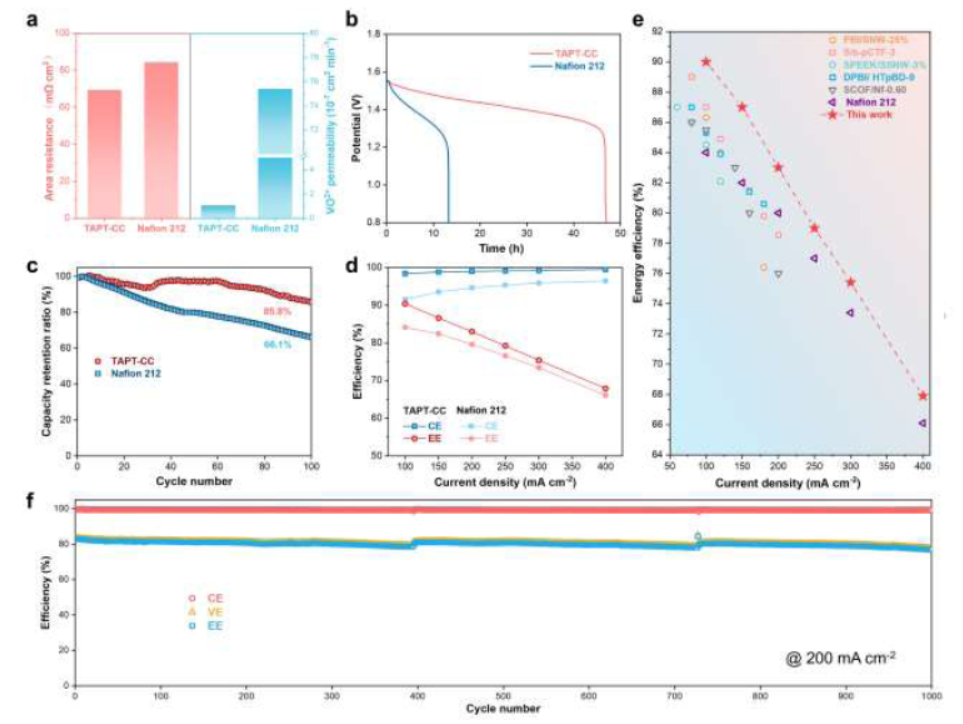 1) 将TAPT-CC膜浸泡在3 M H2SO4、6 M KOH和1.5 M V 5+/3 M H2SO4溶液中140天,FT-IR谱图和SEM图像与原始状态相比几乎没有变化,证明了膜的卓越化学稳定性。