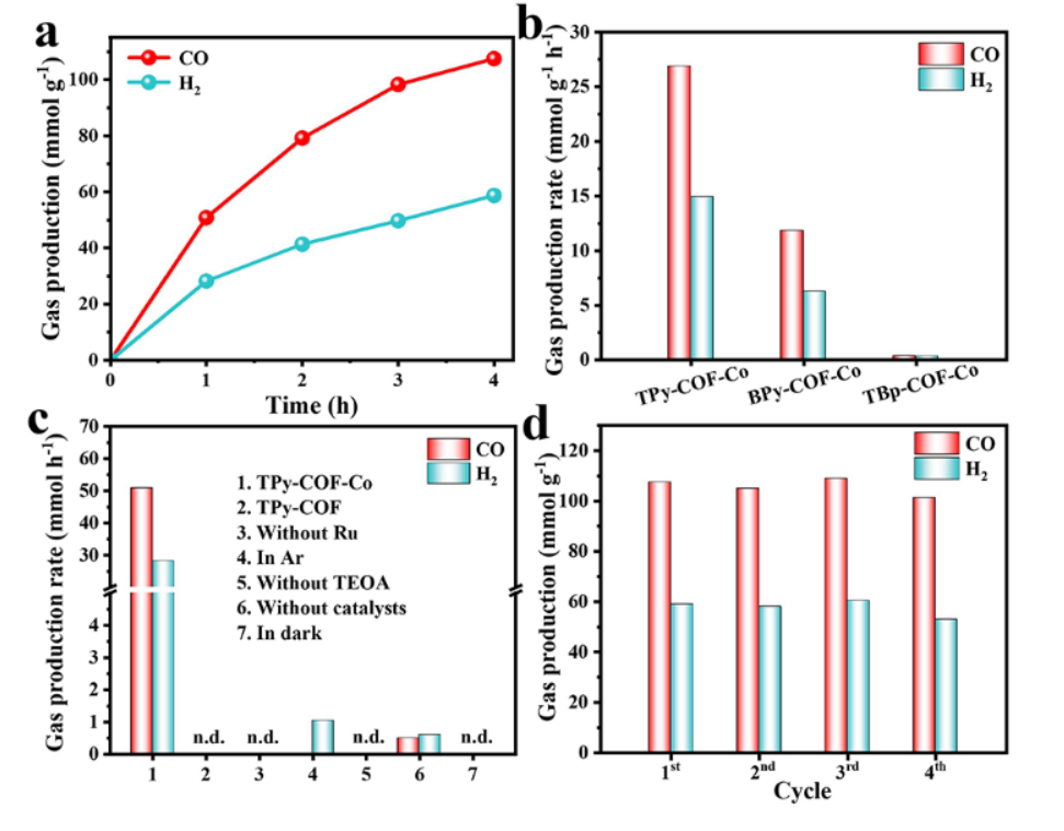 - 光催化CO2还原实验中,TPy-COF-Co在4小时内实现了26.9 mmol g⁻¹ h⁻¹的CO产生率和14.7 mmol g⁻¹ h⁻¹的H2产生率。