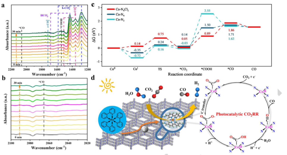 南京工业大学王军老师等报道的本篇文章(Angew. Chem. Int. Ed. 2024, e202415202)中成功构建了一种独特的Co-N4Cl2单一位点,通过将Co物种负载到含有2,2'-联吡啶和三嗪的共价有机框架(COF)中,实现了在可见光照射下将CO2转化为合成气。所得到的催化剂TPy-COF-Co在光催化CO2还原中表现出了创纪录的CO产生率426 mmol g⁻¹ h⁻¹,以及前所未有的转化数(TON)和转化频率(TOF)分别为2095和1607 h⁻¹。该催化剂还展示了良好的回收性能和可广泛调节的合成气产生(CO/H2比例:1.8:1-1:16)。通过包括原位同步辐射X射线吸收精细结构(XAFS)光谱、原位衰减全反射表面增强红外吸收光谱(ATR-SEIRAS)和理论计算在内的系统研究,表明基于三嗪的COF框架促进了电荷转移至单CoN4Cl2位点,极大地促进了CO2的活化,降低了*COOH生成的能量障碍,促进了CO2的转化。这项工作突出了分子调控的COF衍生单原子催化剂在提高CO2光还原效率方面的巨大潜力。