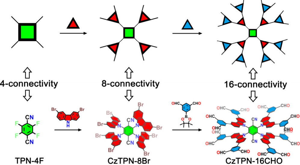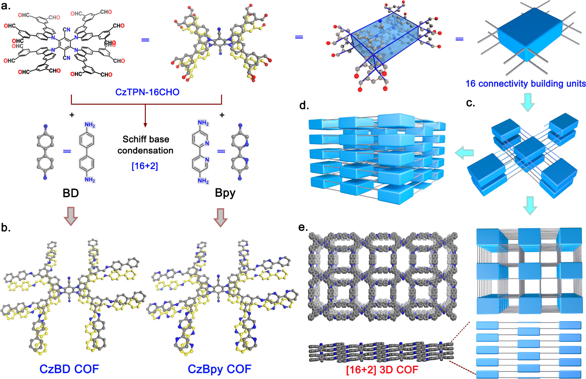 2) 将CzTPN-16CHO与线性二胺连接体(BD或Bpy)在溶剂热条件下进行缩合反应,形成CzBD COF和CzBpy COF。