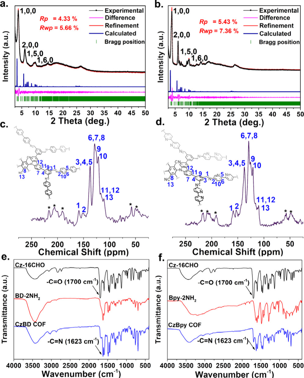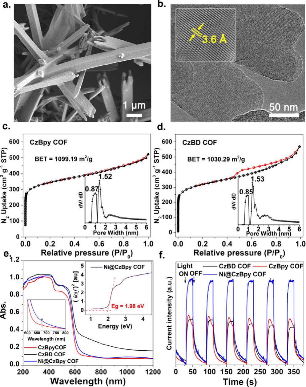 - 测试结果:CzBD COF和CzBpy COF的PXRD图谱显示了与模拟结构相匹配的衍射峰,确认了其结晶性和结构。