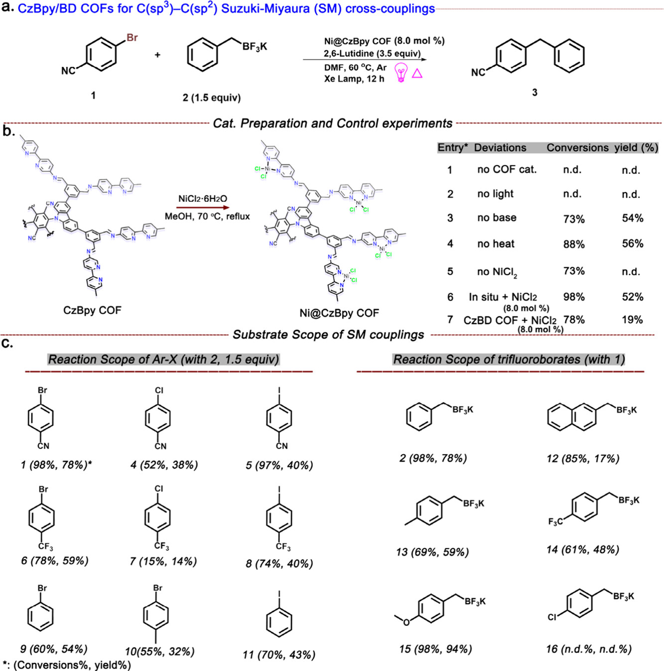 2) 在可见光照射下,使用Ni@CzBpy COF作为催化剂,进行烷基三氟硼酸盐与芳基卤化物的C(sp3)−C(sp2)交叉偶联反应。