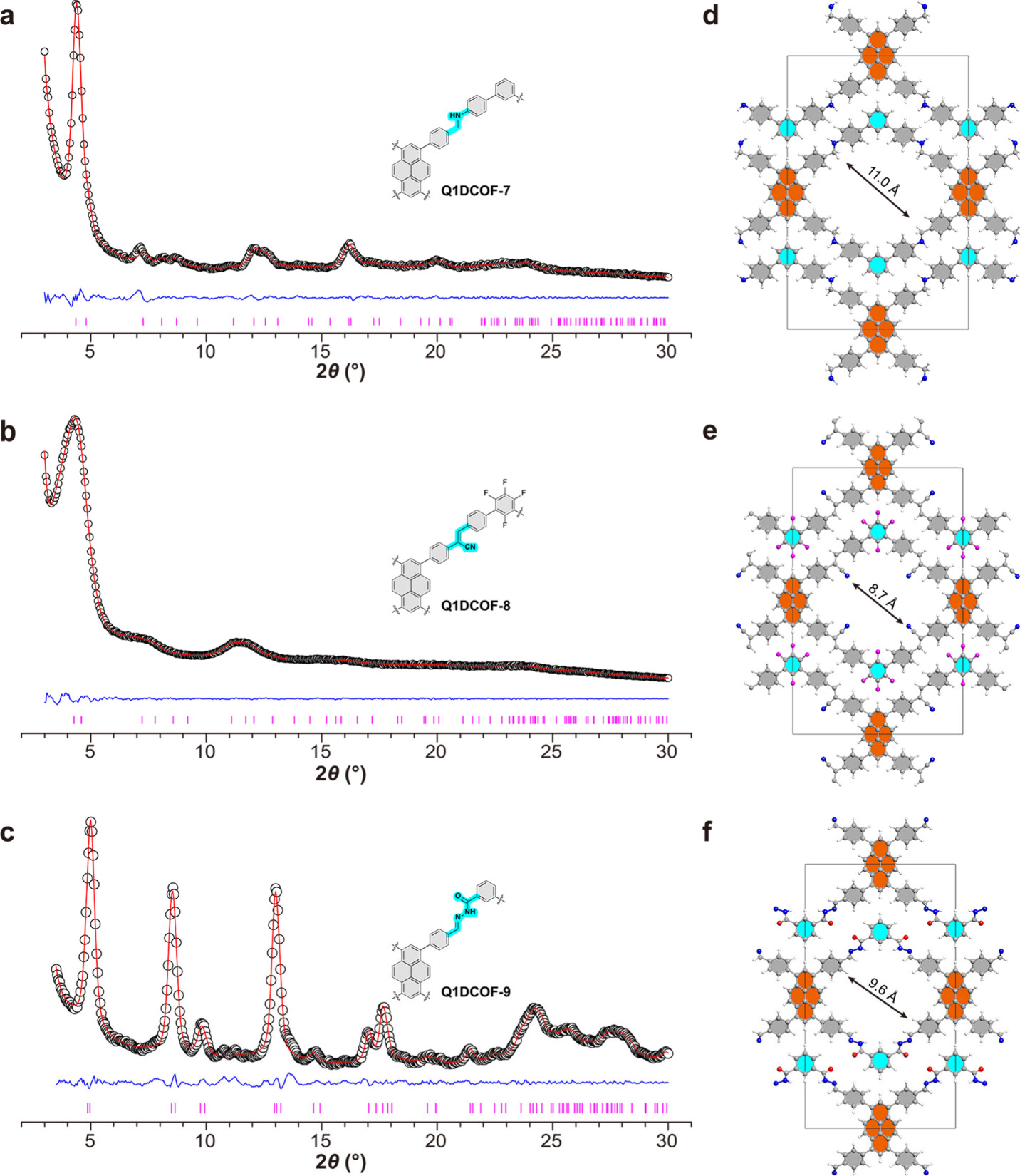 4. 粉末X射线衍射(PXRD)结果:使用Rigaku MiniFlex X射线衍射仪和Cu Kα辐射,扫描速度为10°/min获得。Q1DCOF-3的PXRD图谱显示了在2θ = 4.3°, 7.2°, 8.6°等位置的特征峰,对应于(110), (200), (220)晶面。