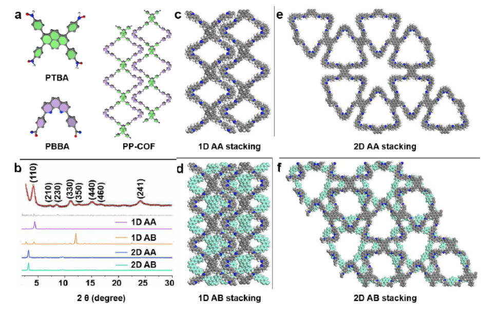 - 使用Rigaku MiniFlex X射线衍射仪进行PP-COF的PXRD测试,结果显示PP-COF的衍射峰与理论模拟的1D-AA堆叠结构一致,表明其高结晶性。