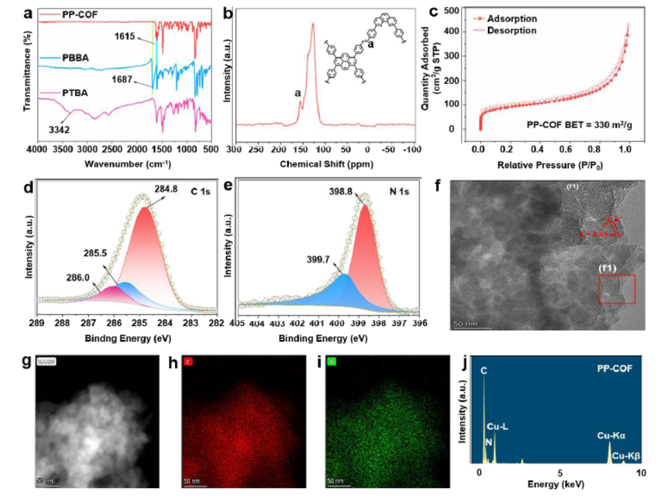 - 在Bruker V70仪器上进行FTIR分析,PP-COF的红外光谱在1615 cm⁻¹处显示出特征峰,证实了亚胺键的存在。