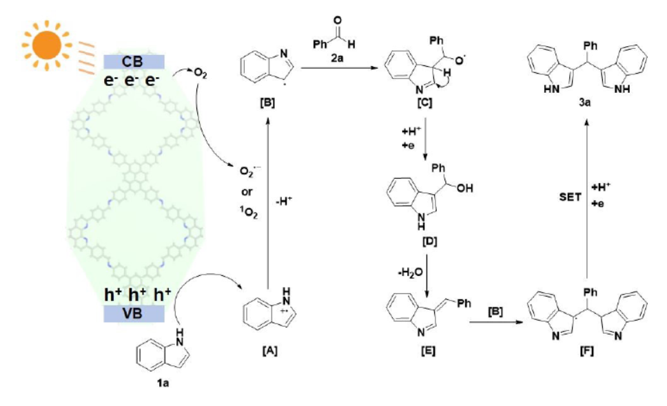 - 在光催化反应中,PP-COF能够有效地将O2转化为1O2和O2•−,促进吲哚的官能化反应,产率高达98%。在氧化硫醇偶联反应中,PP-COF的催化活性表现出优异的稳定性和重复使用性。