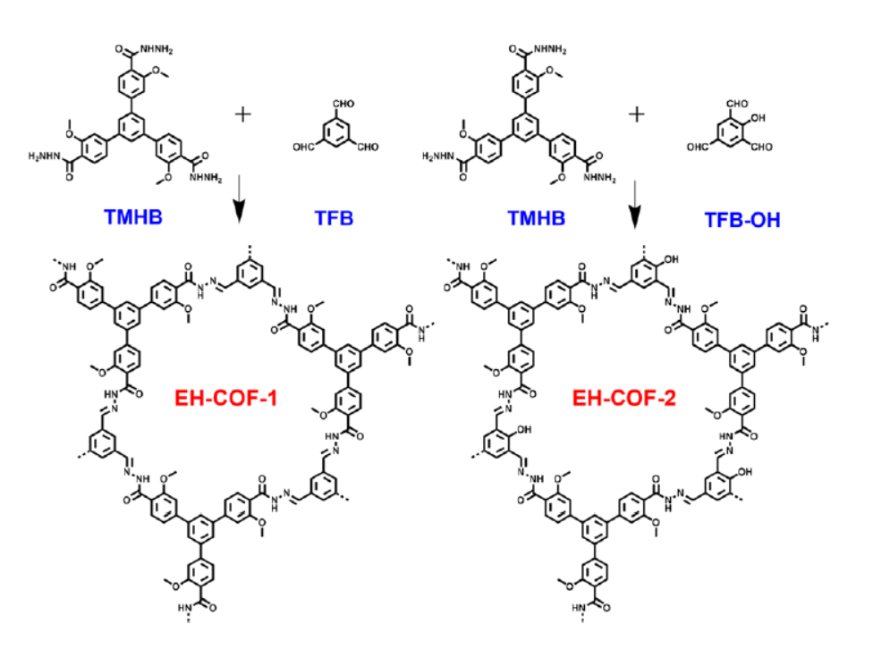 1) 将1,3,5-三(3′-甲氧基-4′-肼羰基苯基)苯(TMHB)和1,3,5-三甲醛苯(TFB)或2-羟基苯-1,3,5-三甲醛(TFB-OH)在含水醋酸作为催化剂的存在下加热,制备EH-COFs。