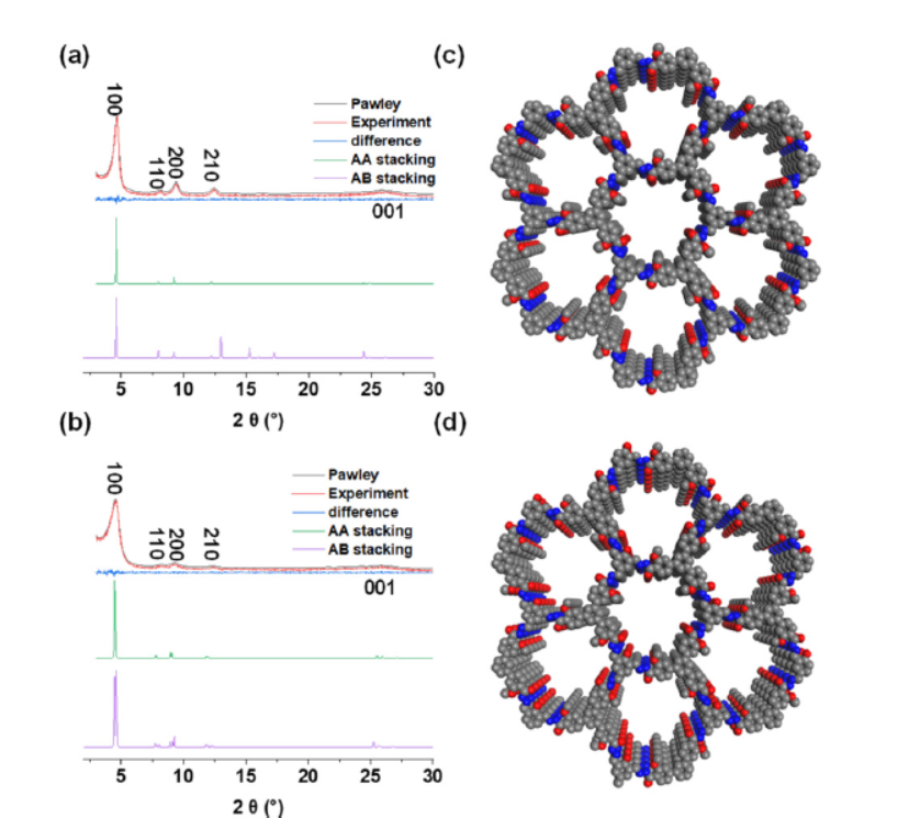 1) EH-COF-1和EH-COF-2的PXRD分析结果表明它们具有高度结晶的结构。