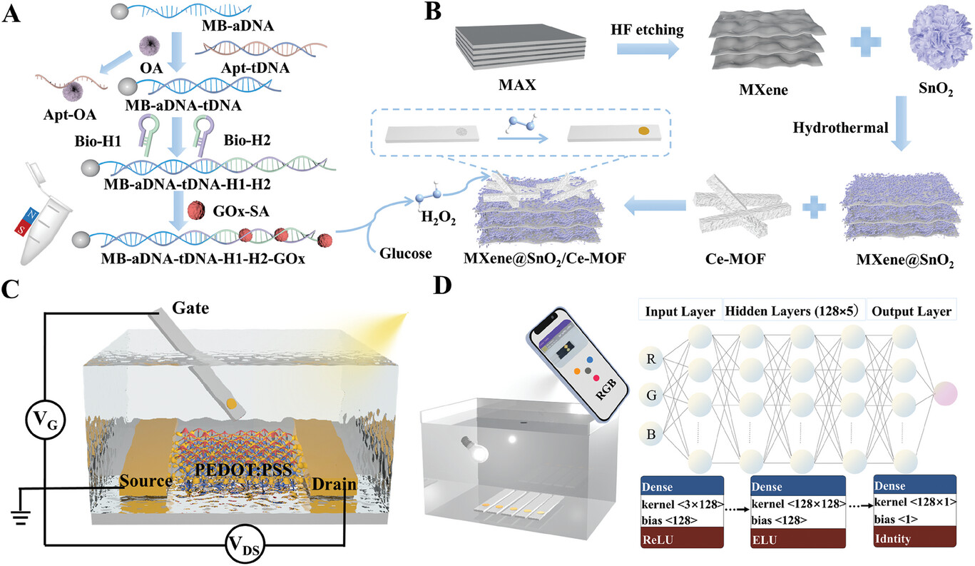 )中开发了一种基于MXene@SnO2-Ce-MOF (MXSnO/Ce-MOF) Z型异质结构的高精度磁性辅助有机光电晶体管(OPECT)和智能手机比色法(SCL)双模式生物传感平台,用于检测有害藻类毒素海达酸(OA)。该平台通过生物催化反应进行信号放大,实现了对OA的高灵敏度和高精确度检测。研究中制备了富含氧空位的MXSnO/Ce-MOF异质结构作为光活性材料。在OA存在的情况下,通过特定的DNA和适配体的相互作用触发了链式反应,产生长的双螺旋链以捕获葡萄糖氧化酶(GOx)。捕获的GOx催化葡萄糖产生H2O2,进一步氧化Ce-MOF,导致电极颜色变化和光电流显著下降。该OPECT-SCL生物传感器展现了出色的灵敏度和精确度,检测限分别为42.9 pM和1.2 nM,成功实现了对实际样品中OA的自动化检测。