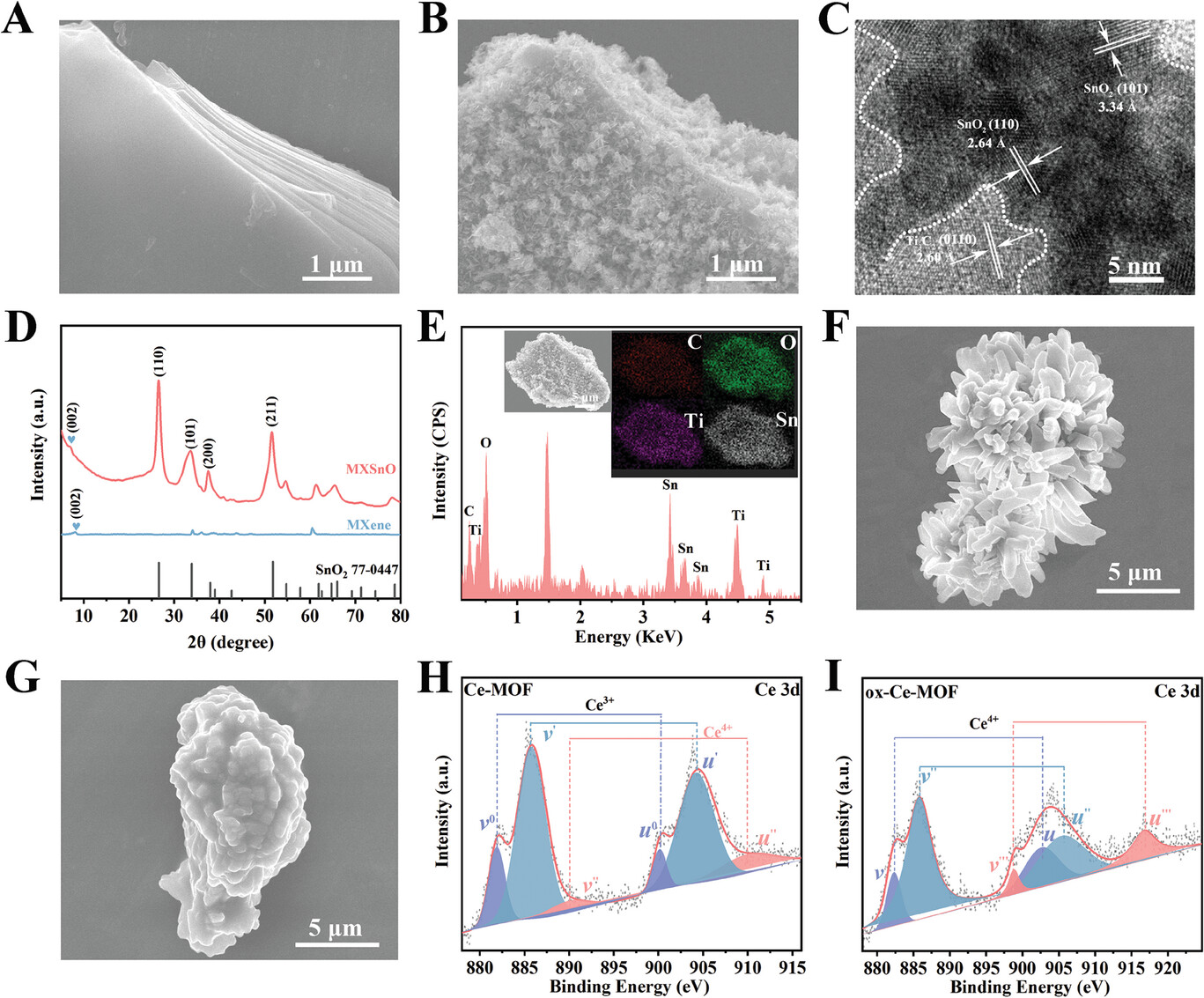- FESEM和HRTEM结果显示MXene呈现平滑的层状结构,MXSnO呈现SnO2纳米片包裹MXene的形态。