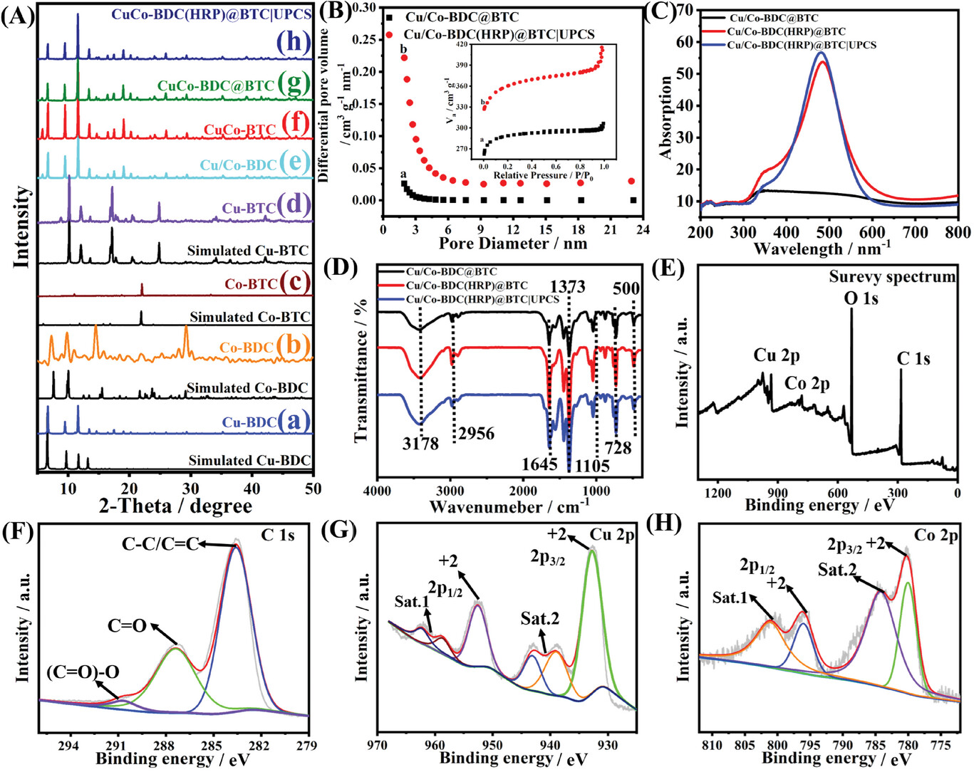 - Cu/Co-BDC@BTC和Cu/Co-BDC(HRP)@BTC|UPCS的比表面积分别为877 m2 g−1和1108 m2 g−1,孔径分别为2.16 nm和2.38 nm。
