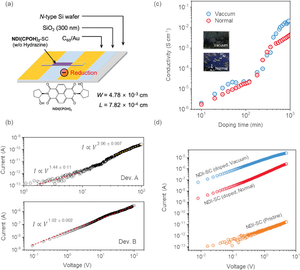 3) 电子特性的表征:制备了基于原始和肼掺杂NDI(CPOH)2-SCs的两种器件,进行了电流-电压(I-V)测量。实验结果显示,原始器件(Device A)在高电压下呈现非线性特征,而肼掺杂器件(Device B)继续遵循欧姆定律。