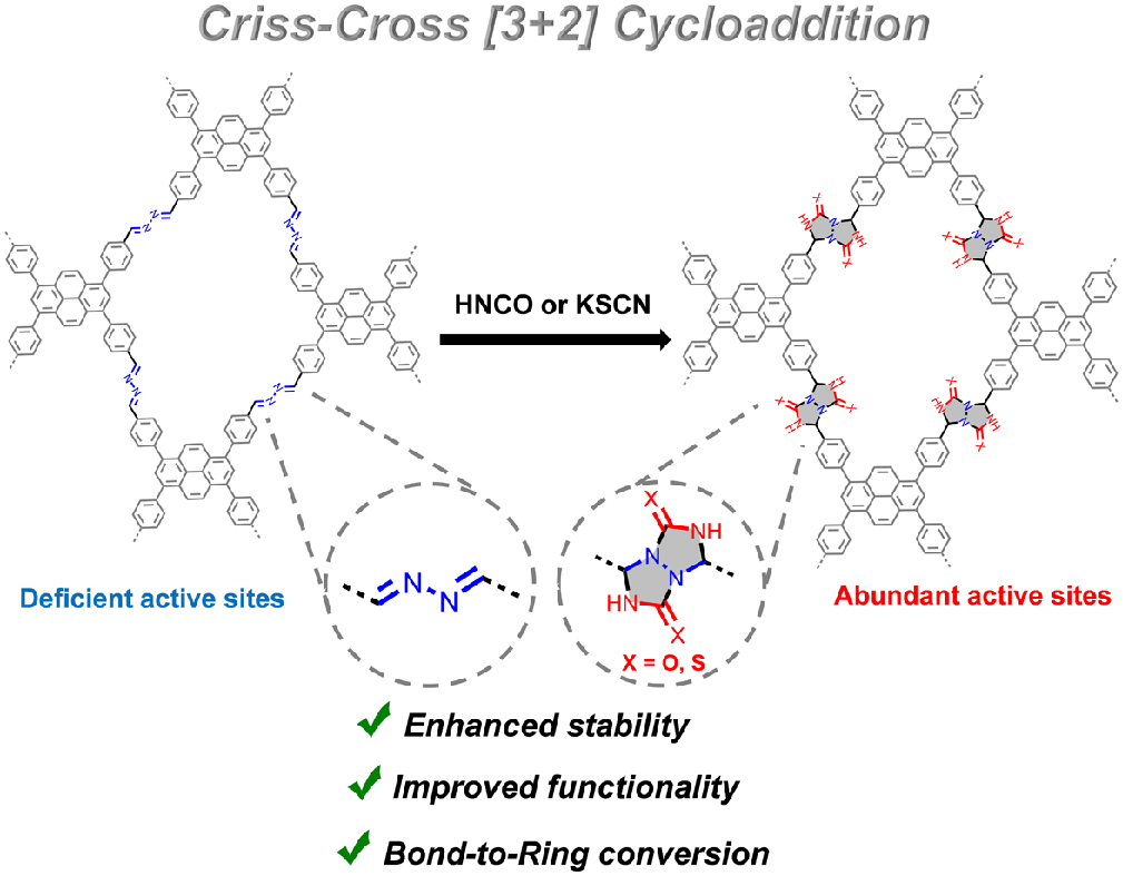 1) 上海有机所赵新老师课题组发表的文章(CCS Chem. 2024, 6, 2230-2240)报道了一种通过交叉[3+2]偶极环加成反应将双腙键转化为(硫)脲基融合环连接的策略,成功制备了新型共价有机框架(COFs)。这些环化的COFs通过锁定前驱体中的动态C=N键,展现出了增强的化学和热稳定性。