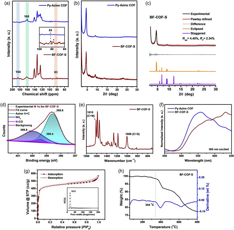 8) 证明从Py-Azine COF到BF-COF-S的转化:FT-IR光谱显示C=N的伸缩振动在1617 cm−1处强度降低,但仍然存在,表明C=N的环化反应不完全。固态13C CP-MAS NMR结果显示,BF-COF-S中C=N的碳信号降低,但仍然存在,同时出现了新的峰值,对应于sp3碳和C=S。