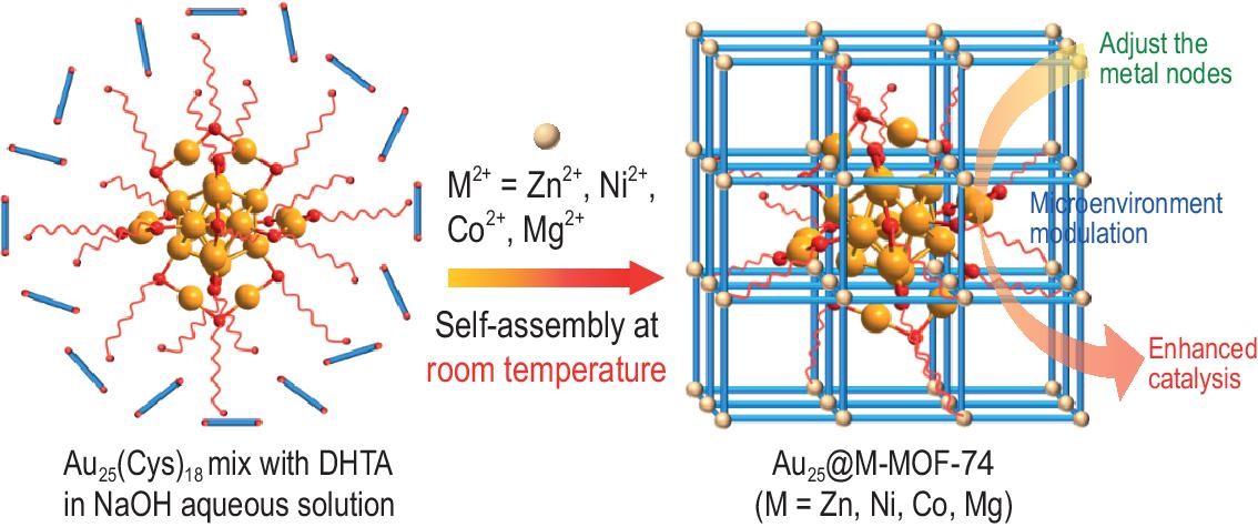 1) 中科大江海龙老师等发表的文章(National Science Review, 2024, 11, 9, nwae095)中报道了一种将原子级精确的金25(Cys)18纳米簇封装到多变量金属-有机框架(MOFs)中的策略,制备了Au25@M-MOF-74 (M = Zn, Ni, Co, Mg)。