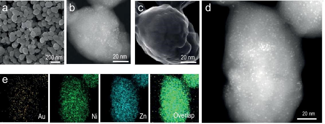 3) SEM和HAADF-STEM图像显示Au25@M-MOF-74和Au25/Ni-MOF-74具有相似的粒径和形貌,且Au25(Cys)18在Ni-MOF-74中均匀分散。