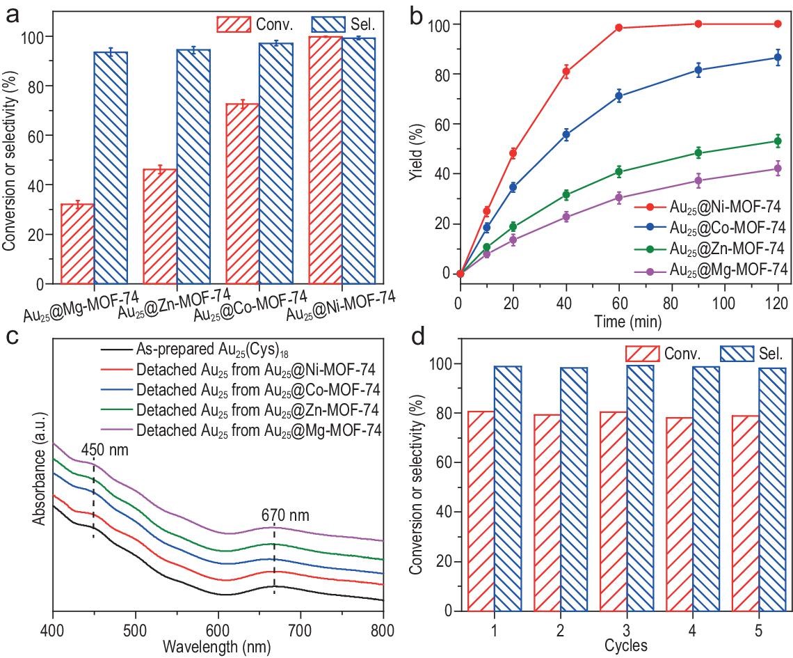 3) 同时,更强的相互作用导致Au25(Cys)18内核的电子密度增加和核心膨胀。因此,活性表现出Au25@Ni-MOF-74 > Au25@Co-MOF-74 > Au25@Zn-MOF-74 > Au25@Mg-MOF-74的趋势,突出了通过表面配体与MOF宿主之间的相互作用调节Au25 NCs周围微环境的关键作用。