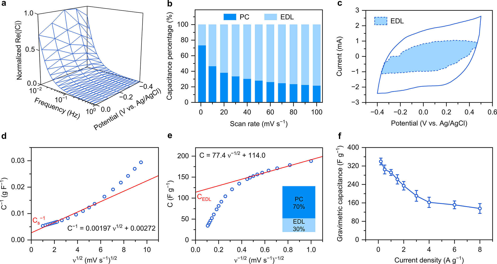 2) 通过循环伏安(CV)和恒流充放电(GCD)测试,评估电极的伪电容响应和比电容。
