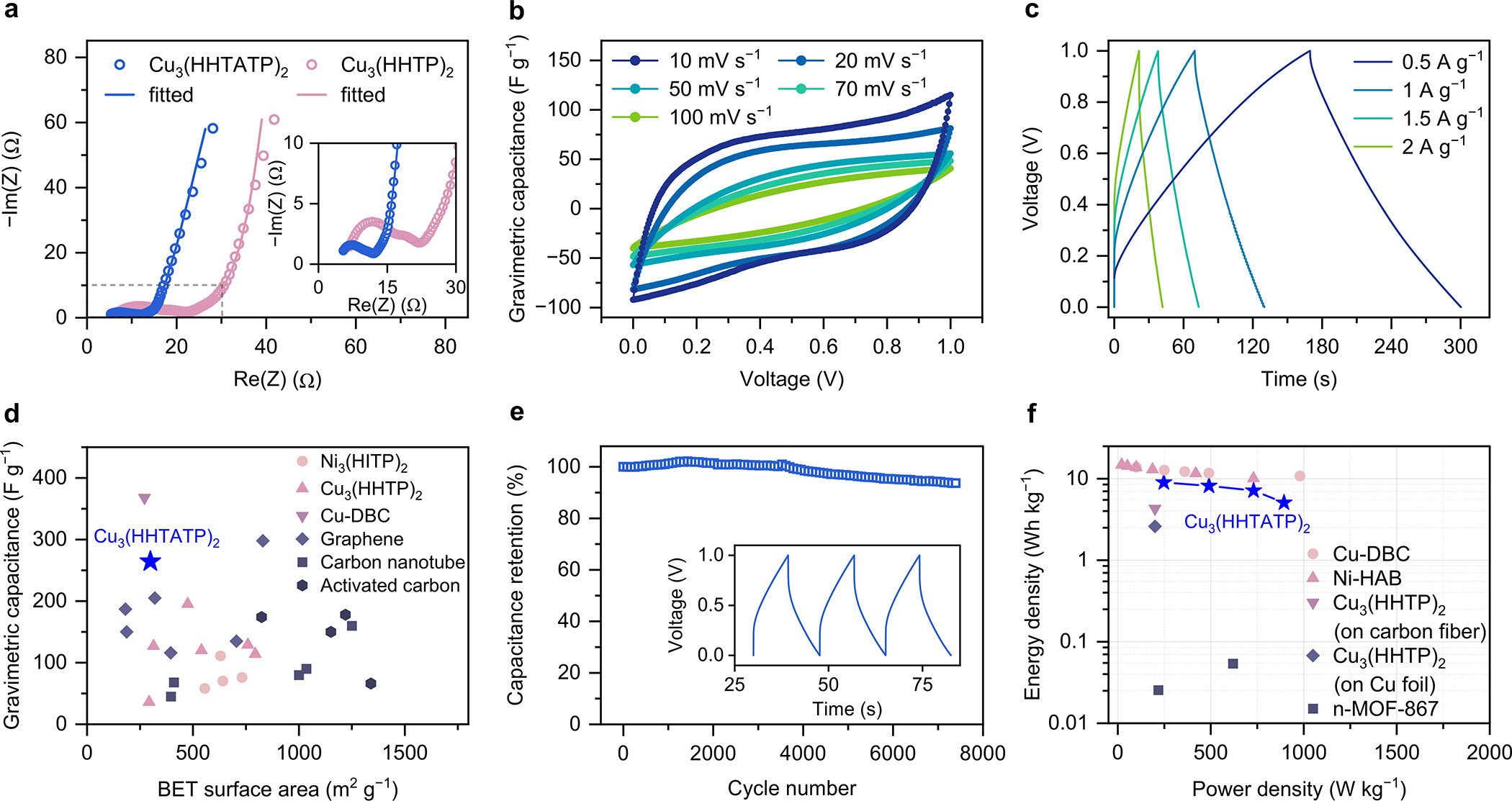 - EIS测试结果显示Cu3(HHTATP)2在低频区域的线性尾部,表明了其超级电容器材料的特征。
