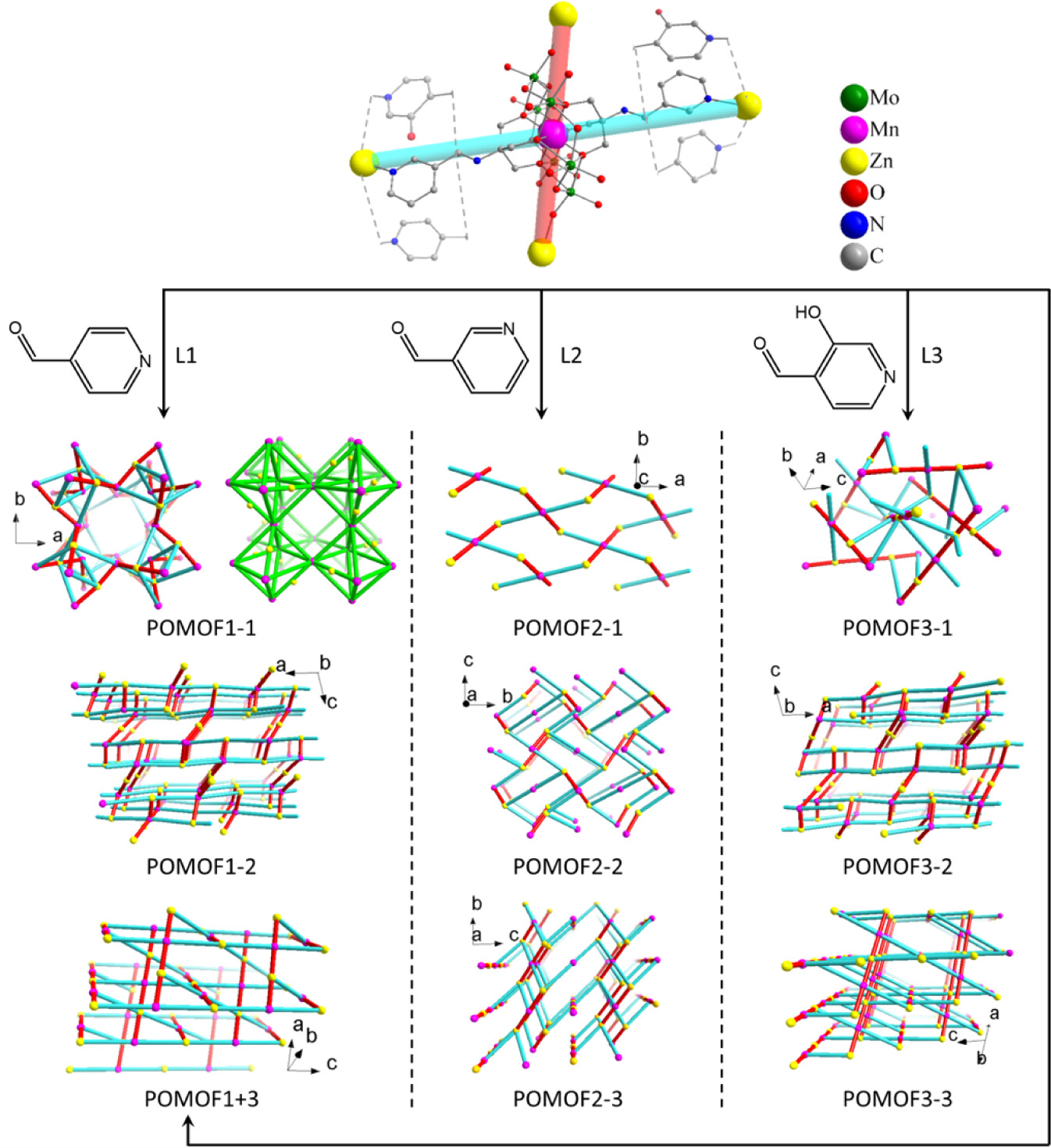 - 实验步骤:选择了δ-Tris基Mn-Anderson(POM-(NH2)2)作为金属源和连接剂,与4-吡啶甲醛(L1)、3-吡啶甲醛(L2)和3-羟基吡啶-4-甲醛(L3)作为有机配体,通过形成亚胺键连接。实验中,POM-(NH2)2与L1和L2通过亚胺化反应形成配位聚合物。
