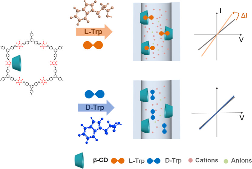 )中构建了一种通过β-环糊精(β-CD)修饰的共价有机框架(COF)膜,用作电化学传感器,实现了色氨酸(Trp)分子的手性选择性检测。由于β-CD位点对L-色氨酸(L-Trp)的优先吸附,增强了CD-COF膜的表面电荷密度和亲水性,导致跨膜离子电流增加。CD-COF膜能有效区分低至0.28 nM浓度的Trp对映异构体。L-/D-色氨酸识别选择性随色氨酸浓度增加而增加,在1 mM时达到19.2。此外,L-Trp对CD-COF膜的选择性吸附还会阻碍其传输,导致L-/D-色氨酸渗透选择性为15.3。这项研究为构建高选择性多孔膜提供了新策略,并实现了高效的手性传感和分离。